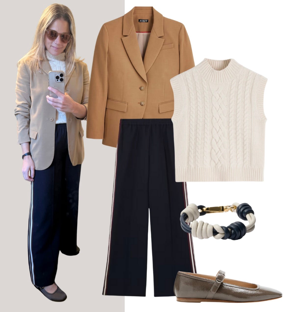 Oops, I actually didn’t wear the brand today, but I did (purposefully) twin with my colleague. We both wore our track pants, which are truly the best dress-up/dress-down pants. He paired with a navy sweater and button-down, I went with an ivory sweater vest and vintage Prada blazer.